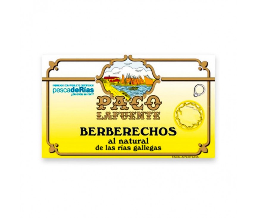 Berberechos al Natural Rías Gallegas 35/45 piezas Paco Lafuente. Uno de los productos estrella de la marca Paco Lafuente. La materia prima es el berberecho (Celastoderma Edule) vivo y fresco procedente de la ría de Noya que se caracteriza por sus excelentes arenales.