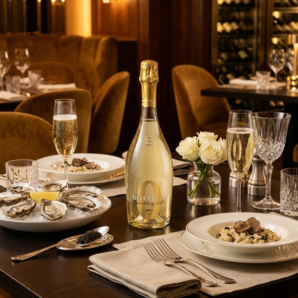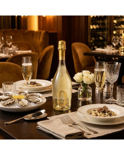 Elaborado con mosto de uva 100% italiano (no vino desalcoholizado). Perlage fino y persistente típico de la casa Bottega. Apto para consumo Halal y bajo contenido calórico.