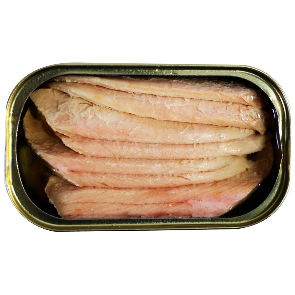 Aussehen: Der helle Thunfischbauch hat eine blassrosa Farbe und ein saftiges und seidiges Aussehen. Die Verpackung in Olivenöl unterstreicht seine Frische und Qualität und bietet eine sorgfältige und attraktive Präsentation.