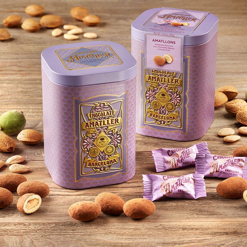 Es wird in einer Metall-Geschenkbox mit 100 g Amatllons präsentiert, die aus einem alten Amatller-Werbematerial entworfen wurde.