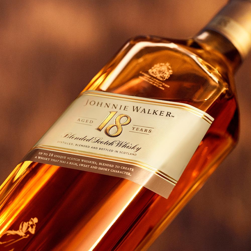 Johnnie Walker 18 Jahre verbindet Johnnie Walkers charakteristische volle Aromen mit faszinierenden zeitgenössischen Noten von Zitrusfrüchten und aromatischen Mandeln. Zunächst süß mit einem warmen Hintergrund von Vanille und einem Hauch von Mandarine, verwandelt er sich am Gaumen sanft in einen leicht trockenen Geschmack von Mandeln und Malz, bevor ein anhaltender Abgang subtile und elegante Rauch- und Zitrusnoten bringt.