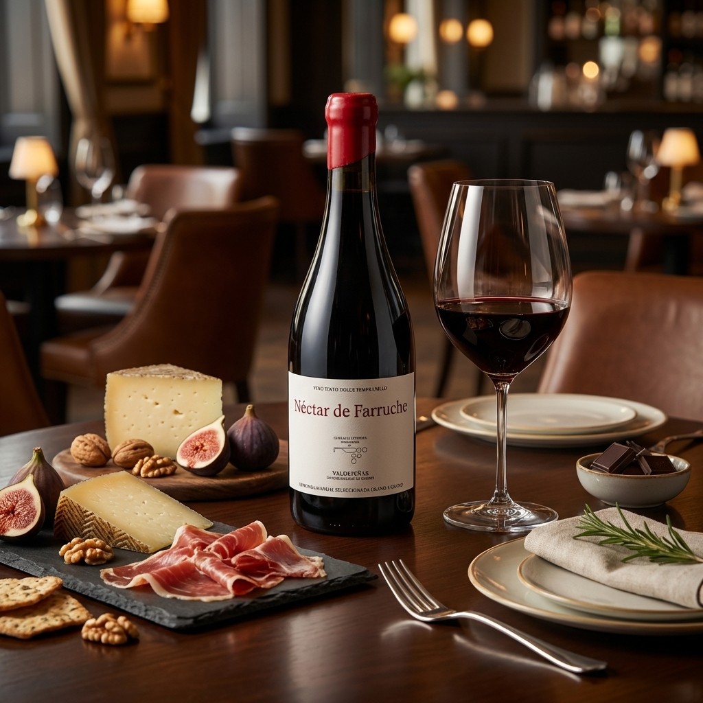 Découvrez l'exclusivité absolue du Néctar de Farruche Tinto Dulce, un véritable joyau œnologique élaboré avec maestria par la cave Corrales Espinosa Family Wines sous l'égide de la prestigieuse D.O. Valdepeñas.