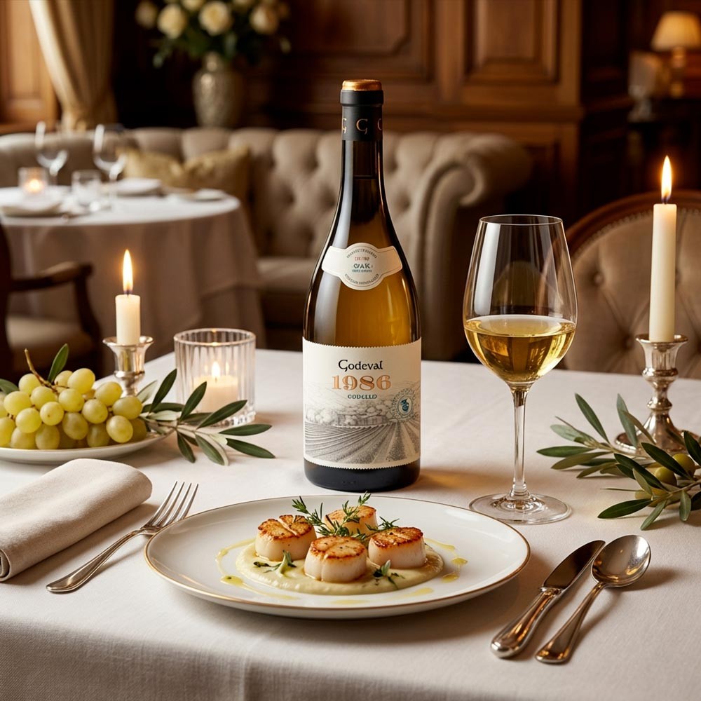 Servir entre 9-12°C en copa tipo Borgoña para favorecer la oxigenación. Ideal con mariscos nobles (bogavante), pescados grasos al horno y carnes blancas trufadas.