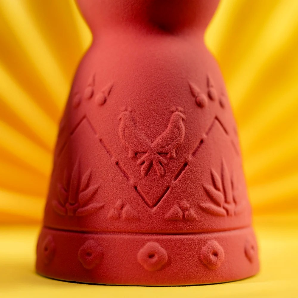 El tapón de la botella está elaborado manualmente utilizando una técnica que implica la aplicación de estambre colorido. Representa un impresionante paisaje de montañas y valles desérticos, adornado con la imagen de pinzones de intenso color rojo volando sobre él. La creación de cada tapón requiere más de tres horas de meticuloso trabajo por parte de nuestros artesanos.