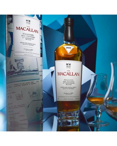 The Macallan Diamonds Are Forever é uma edição limitada de whisky escocês single malt que presta homenagem ao universo de Diamonds Are Forever e ao icónico agente James Bond. Esta criação exclusiva da The Macallan capta a essência cinematográfica e o espírito sofisticado da saga, tornando-se uma peça indispensável para colecionadores e apreciadores de whisky premium.
